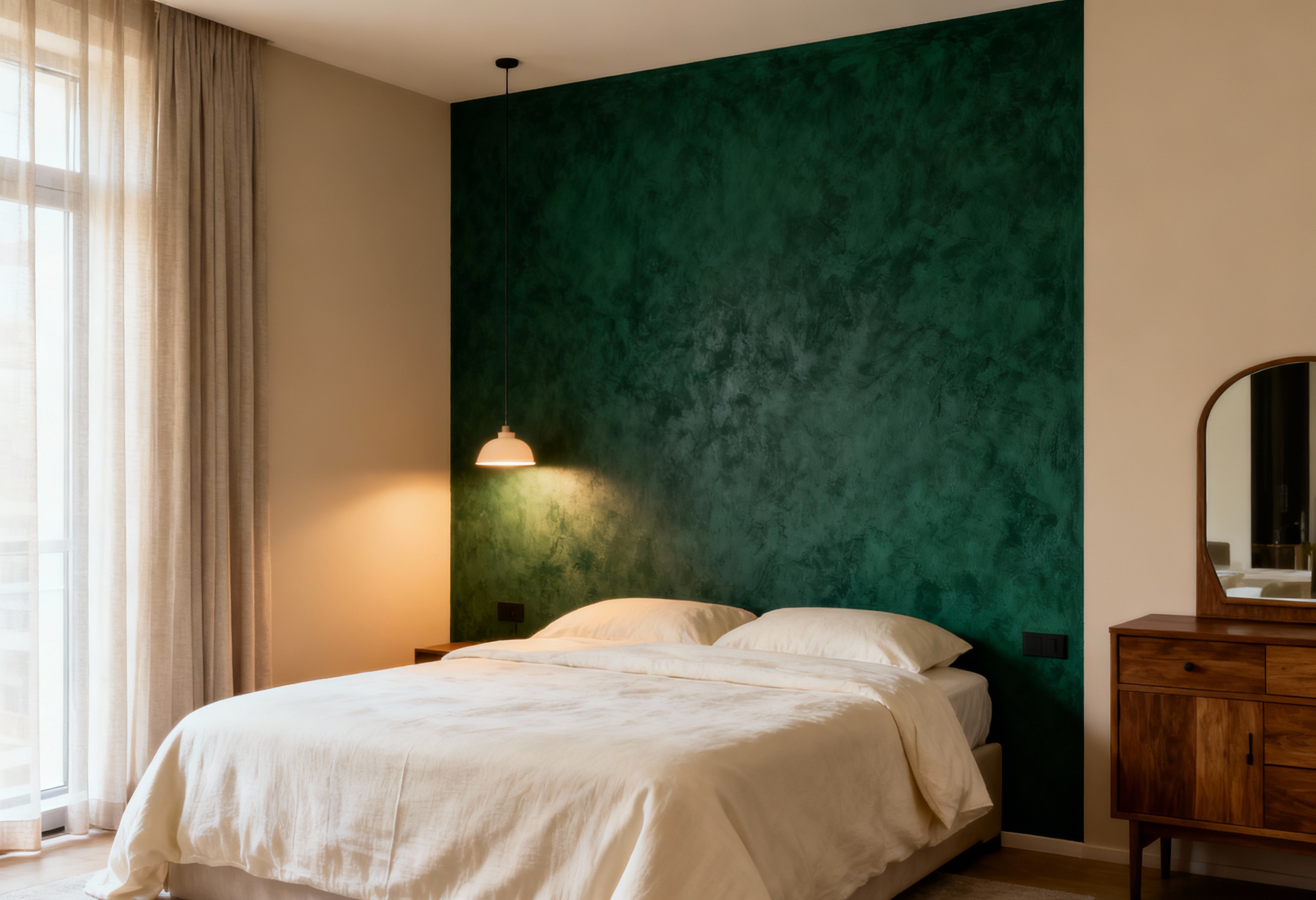 Из моего опыта: будьте осторожны с чрезмерно яркими и насыщенными пигментами. Спальня — место для отдыха. Лучше выбрать сложный, приглушенный оттенок, который будет играть новыми гранями при разном освещении — от утреннего солнца до вечернего бра.