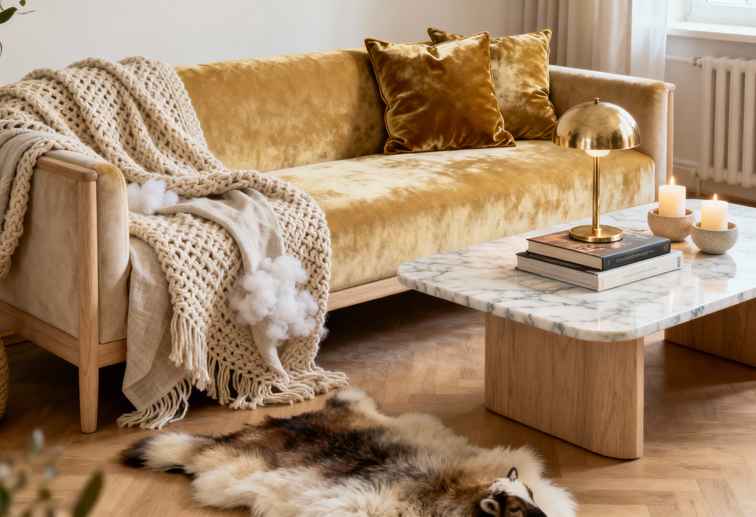 — Добавляйте текстиль из натуральных тканей — шерсть, лен, мех — для тактильного уюта. Не бойтесь наслаивать текстуры: ворсистый ковер, льняные шторы, шерстяной плед, шелковые декоративные подушки. Это делает интерьер объемным и по-настоящему домашним.